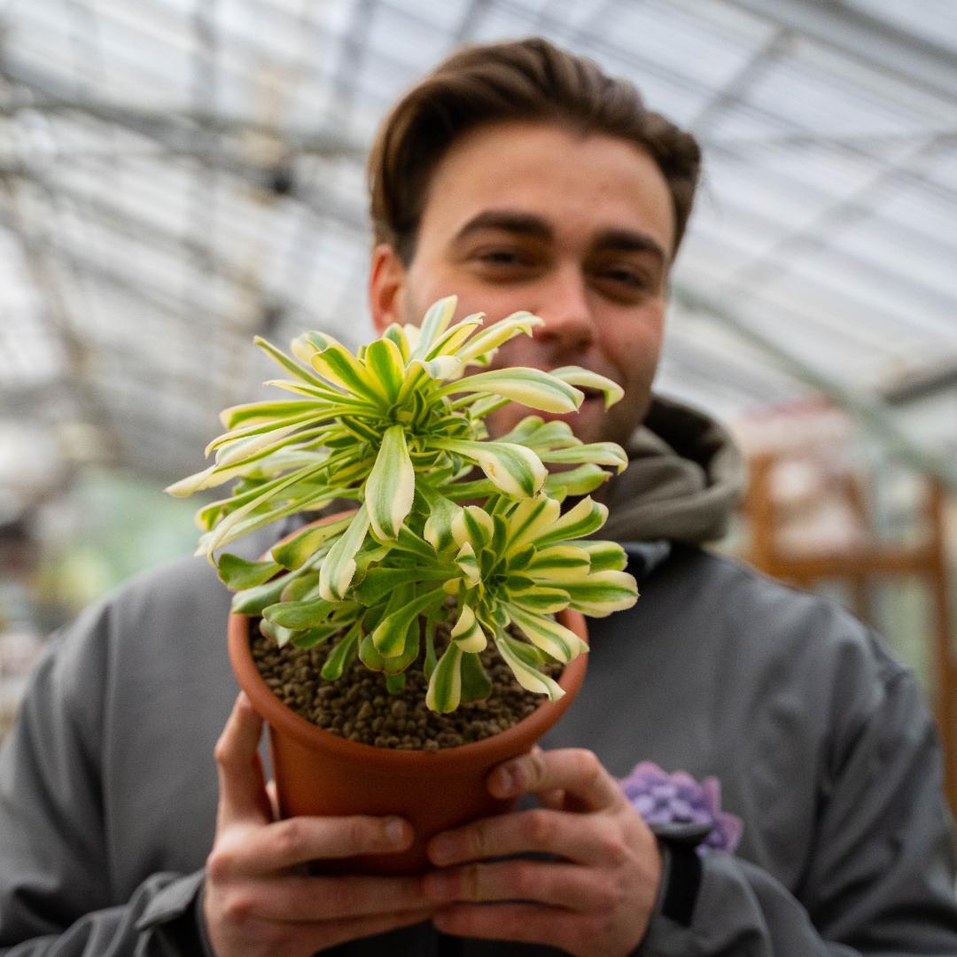 L’Aeonium Arboreum Luteovariegatum viene fornito in vaso Ø 18 cm con etichetta recante il nome botanico.
