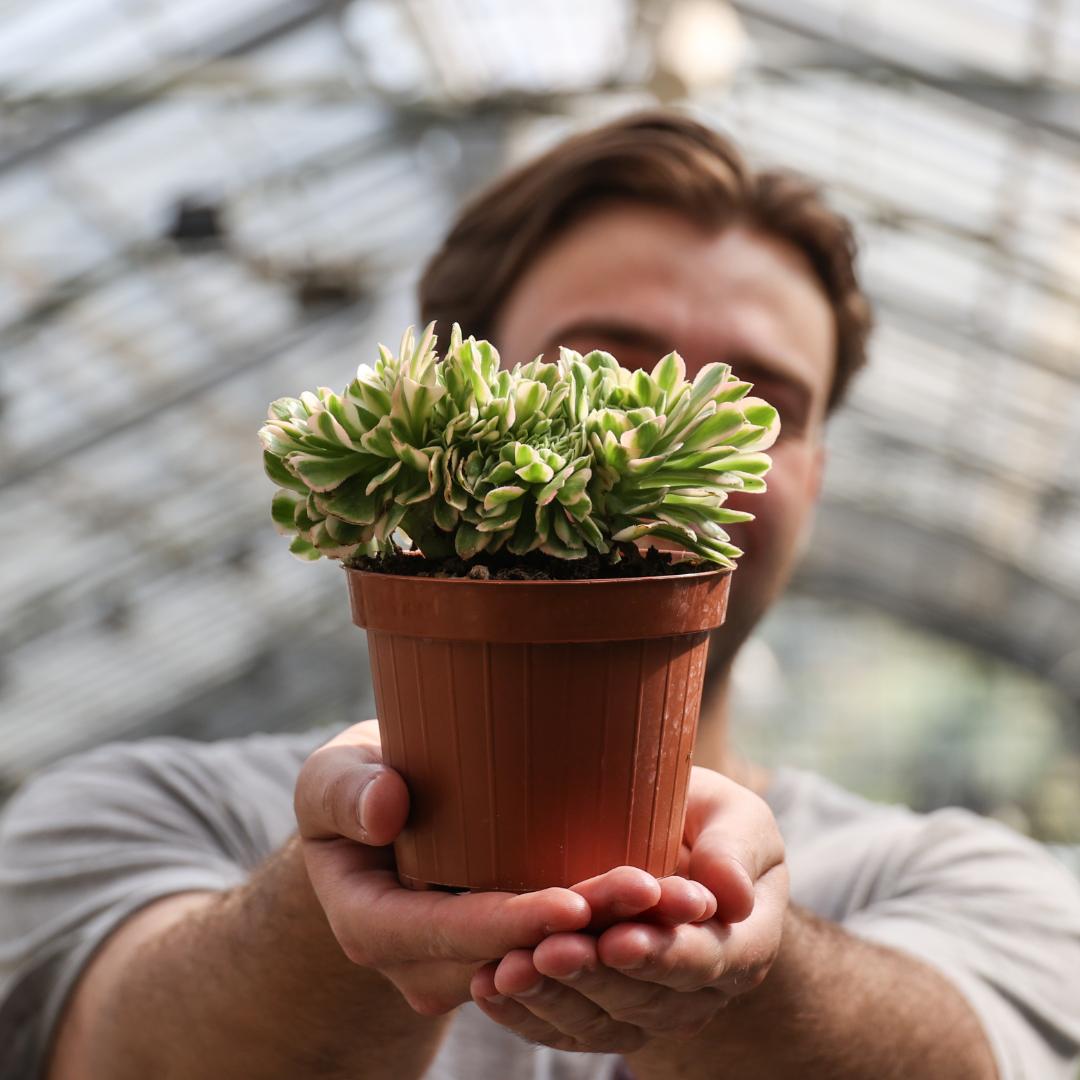 Appartenente alla famiglia delle Crassulaceae, questa pianta rara di Aeonium Maybach crestato è fornita in un vaso Ø 12 cm con un’etichetta che ne riporta il nome botanico.