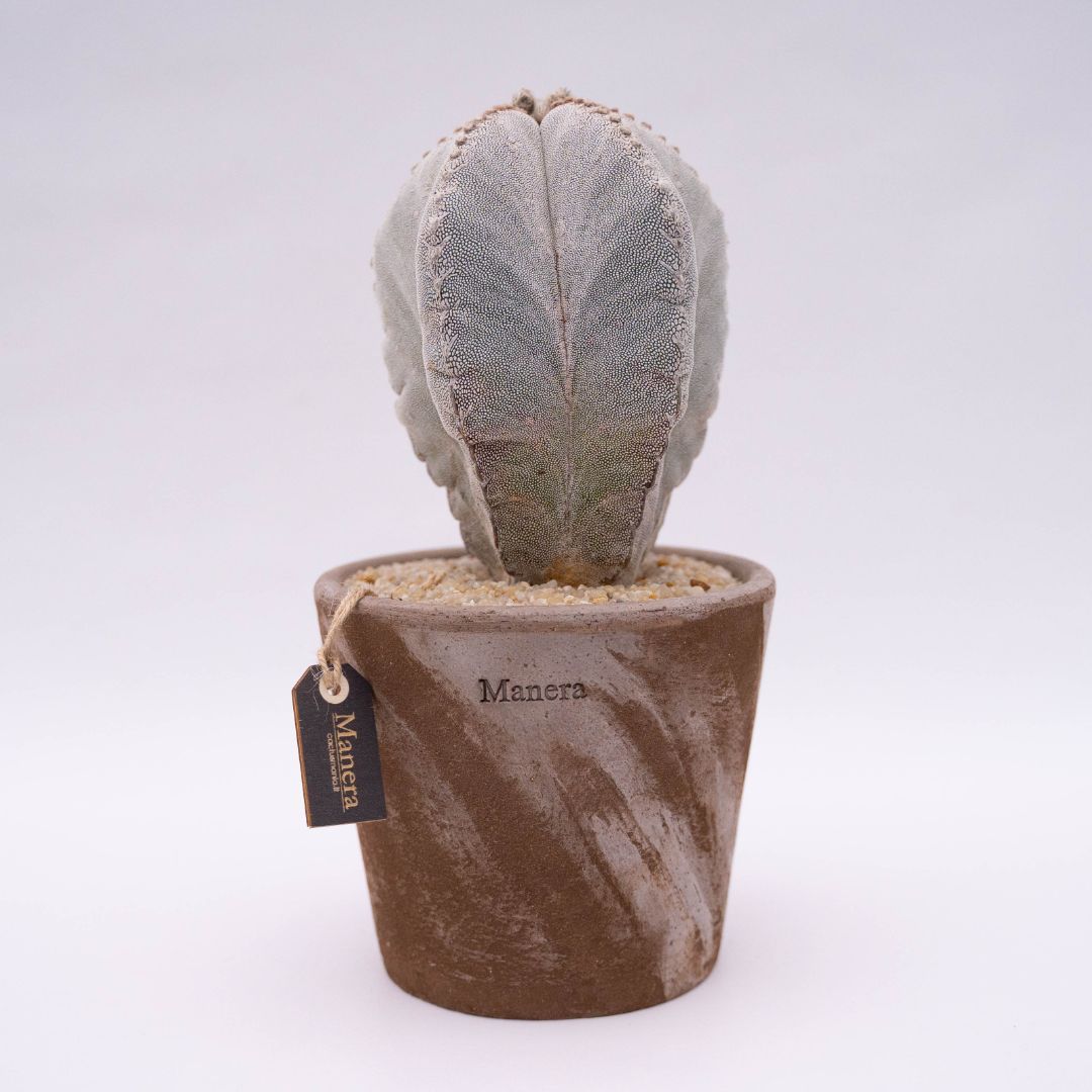 L’Astrophytum onzuka della Linea Manera, appartenente alla famiglia delle Cactaceae, viene fornito nell’elegante vaso in terracotta Choco Ø 16 cm con etichetta recante il nome botanico.