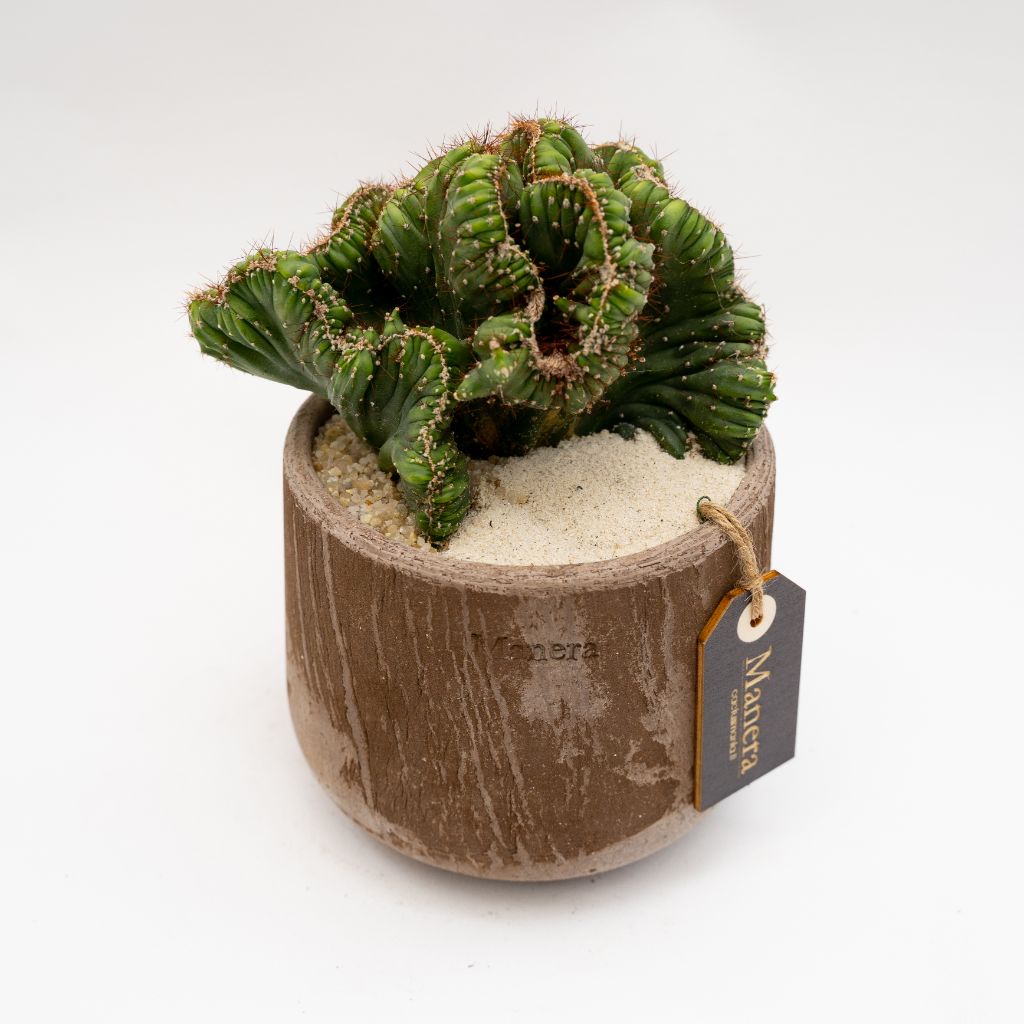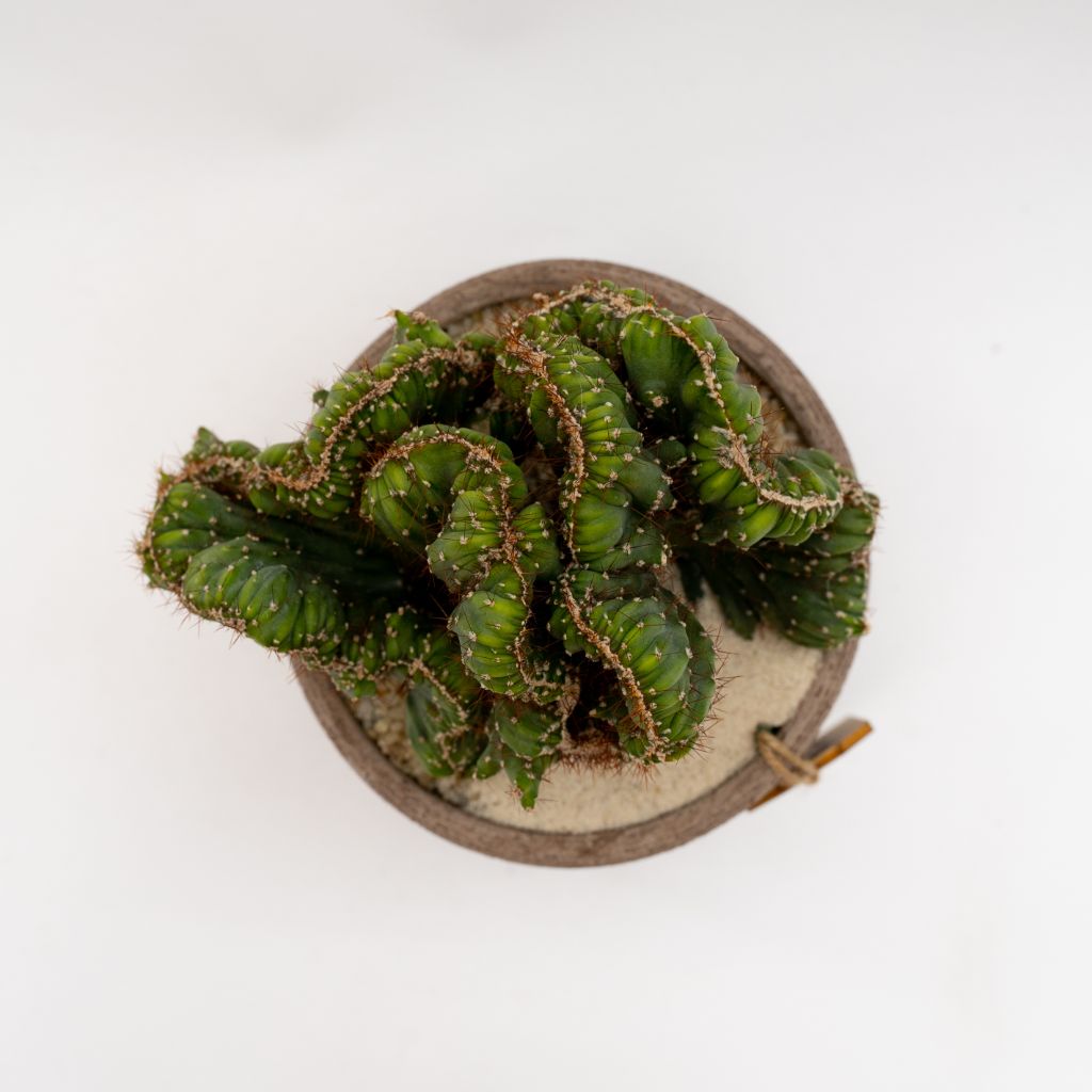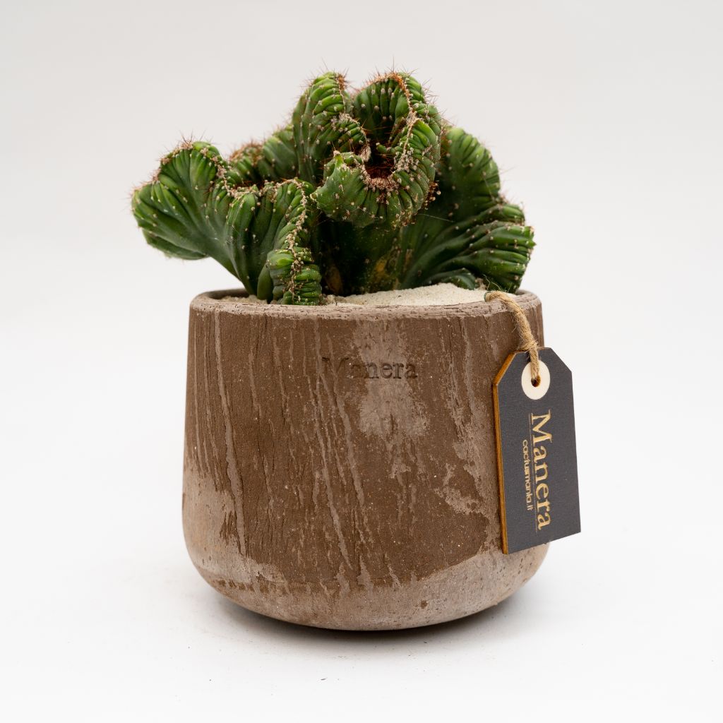 Appartenente alla famiglia delle Cactaceae questa pianta di Cereus peruvianus crestato viene fornita nell’elegante vaso in terracotta Choco small Ø 14 cm con etichetta recante il nome botanico.