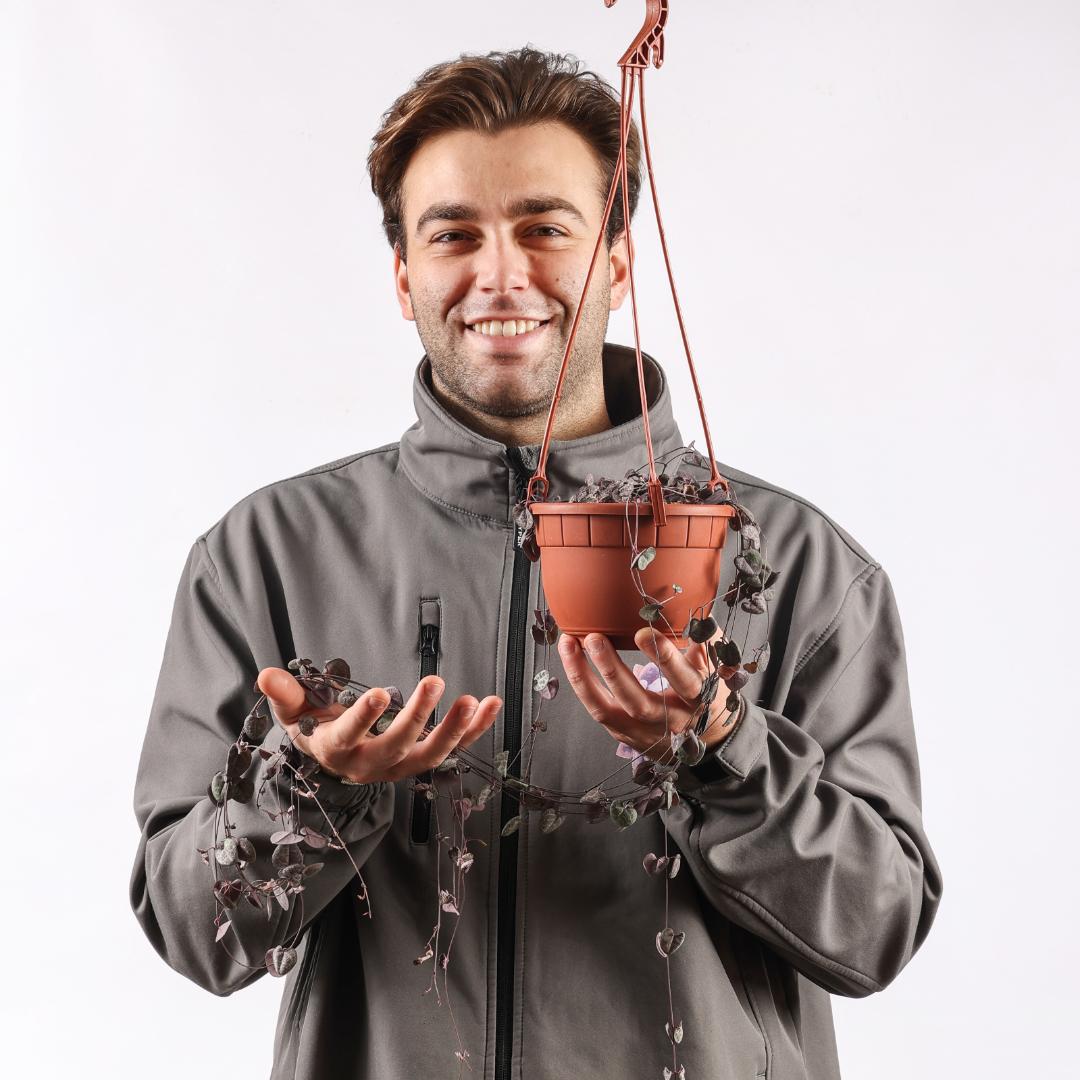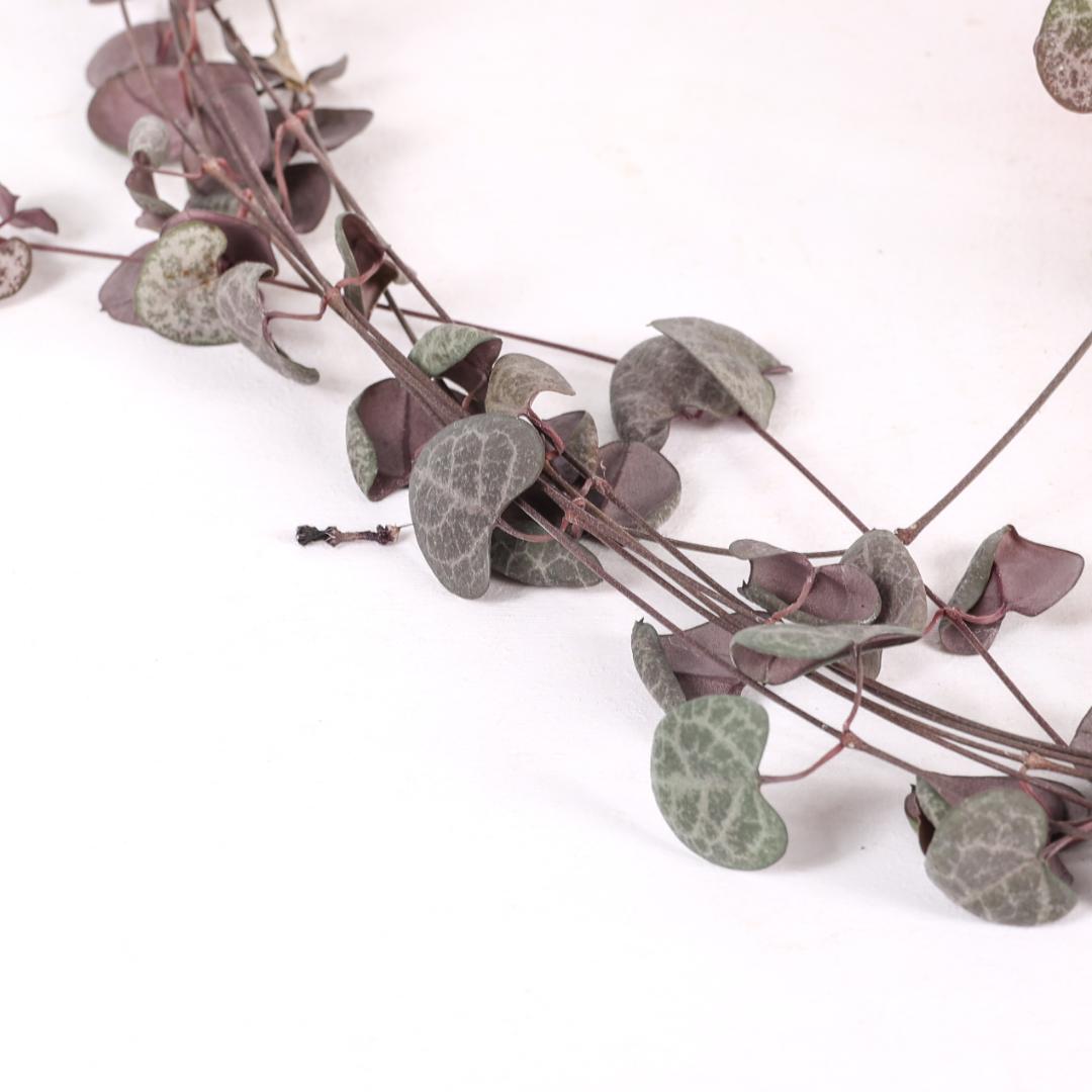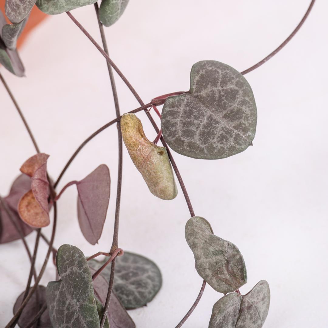 Ceropegia Woodii, pianta rampicante molto decorativa costituita da piccole foglie a forma di cuore con sfumature violacee. Ama essere annaffiata moderatamente, e la luce indiretta. Perfetta per chi ama pianta ricadenti e colorate.