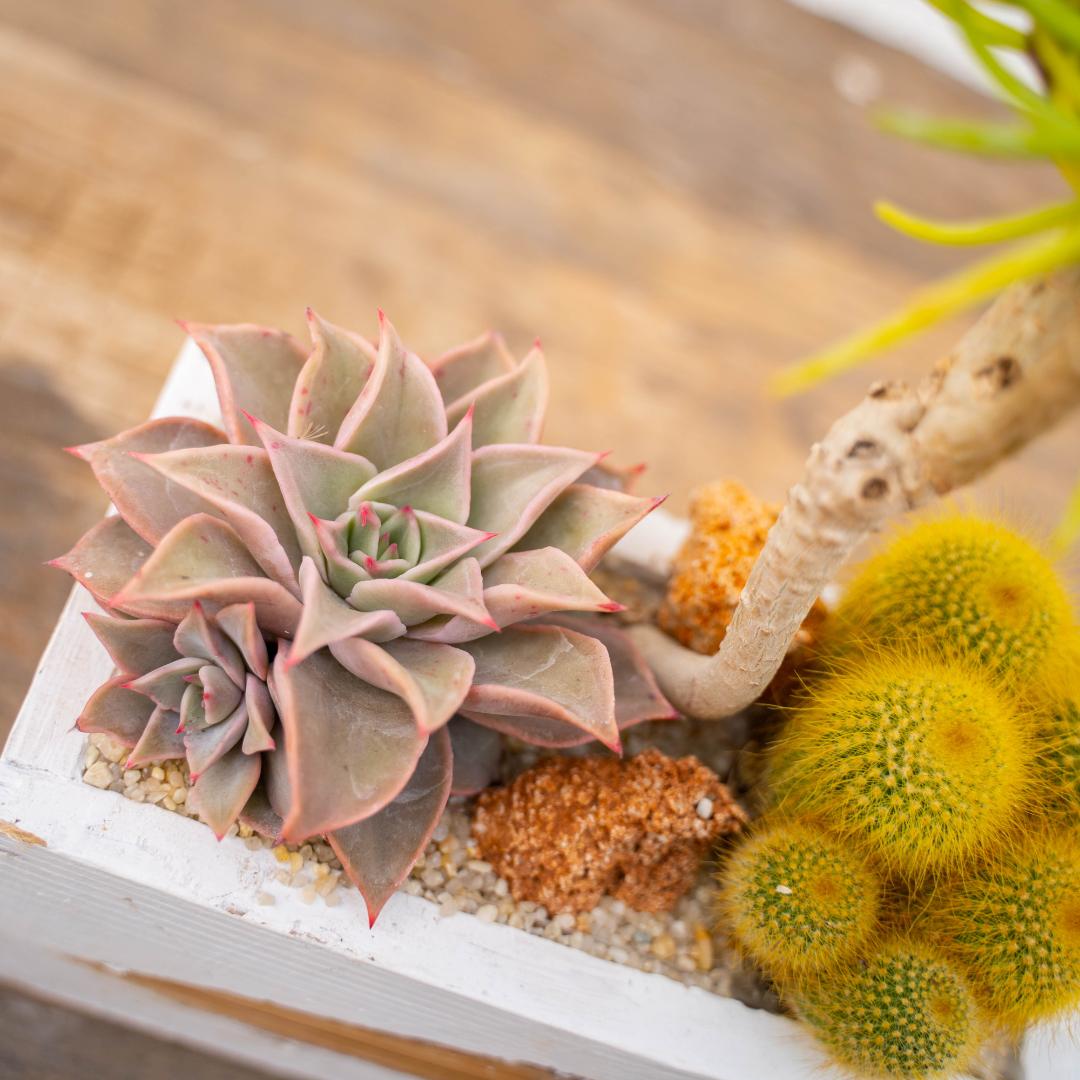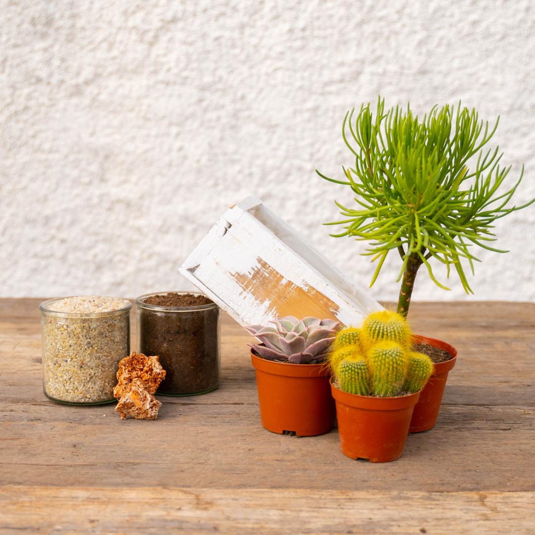 Terra speciale per piante grasse, pietre decorative e ghiaia sono inclusi nel kit.