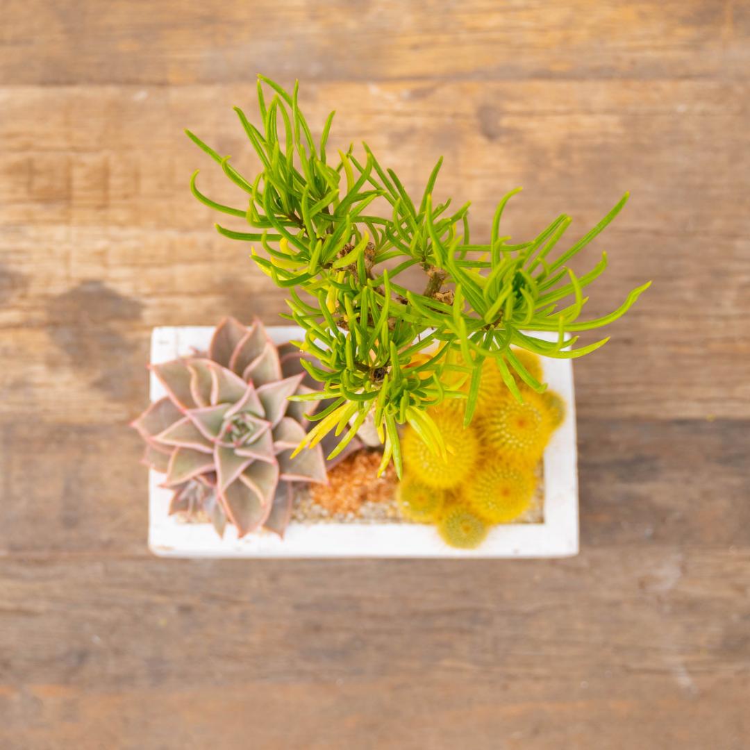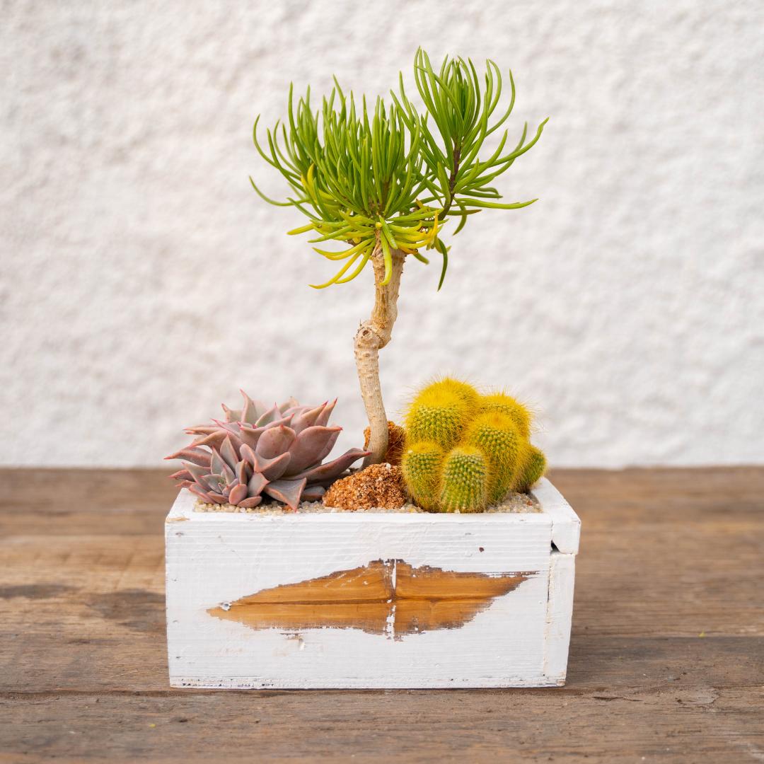 Riceverai anche un vaso in legno (altezza 10 cm, larghezza 12 cm, lunghezza 20 cm), il vaso non è bucato perché è pensato per la tua casa, i tuoi mobili non verranno bagnati da questa composizione. Bagna le piante con parsimonia e amore.