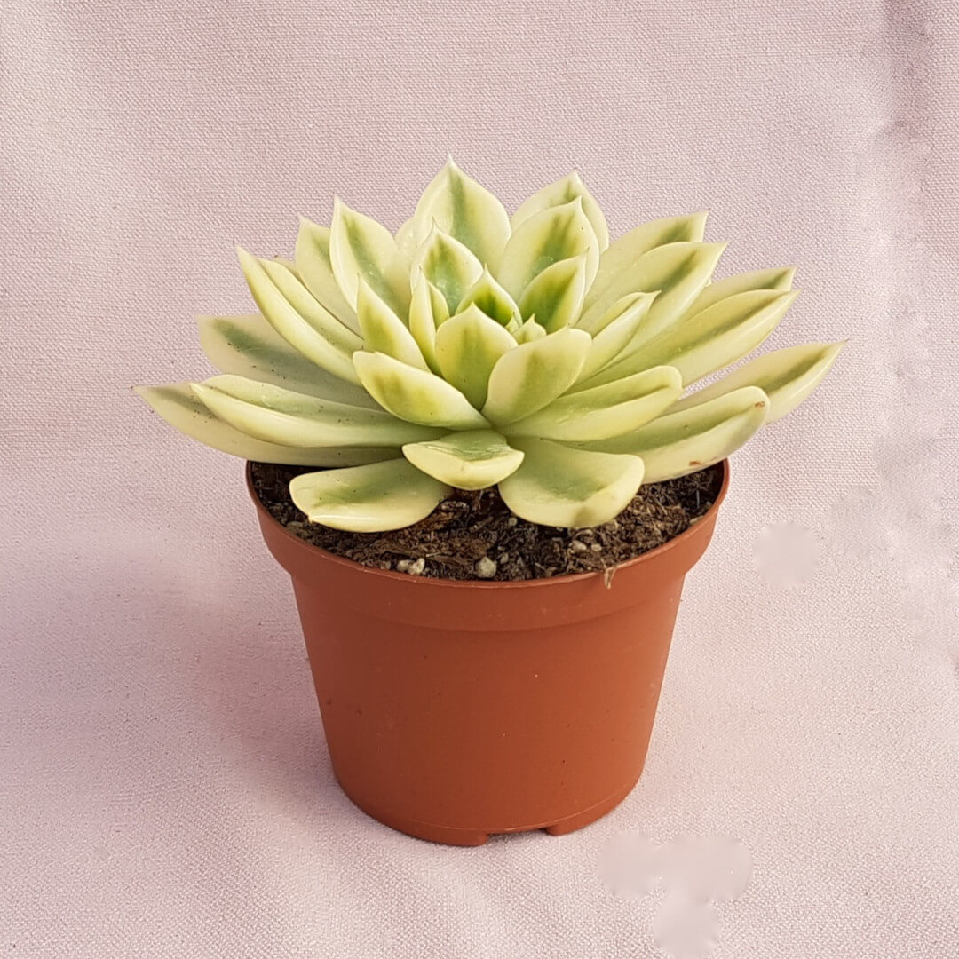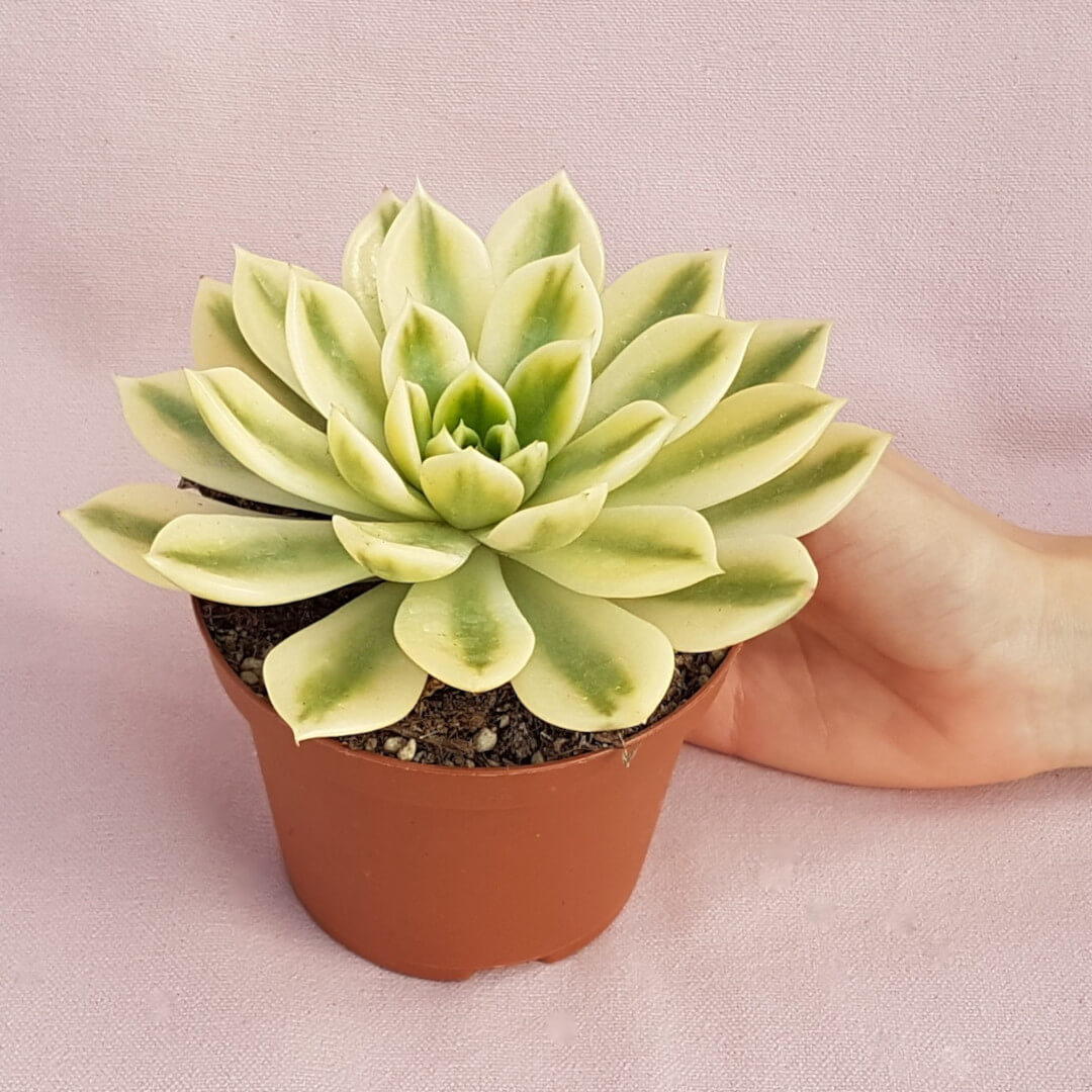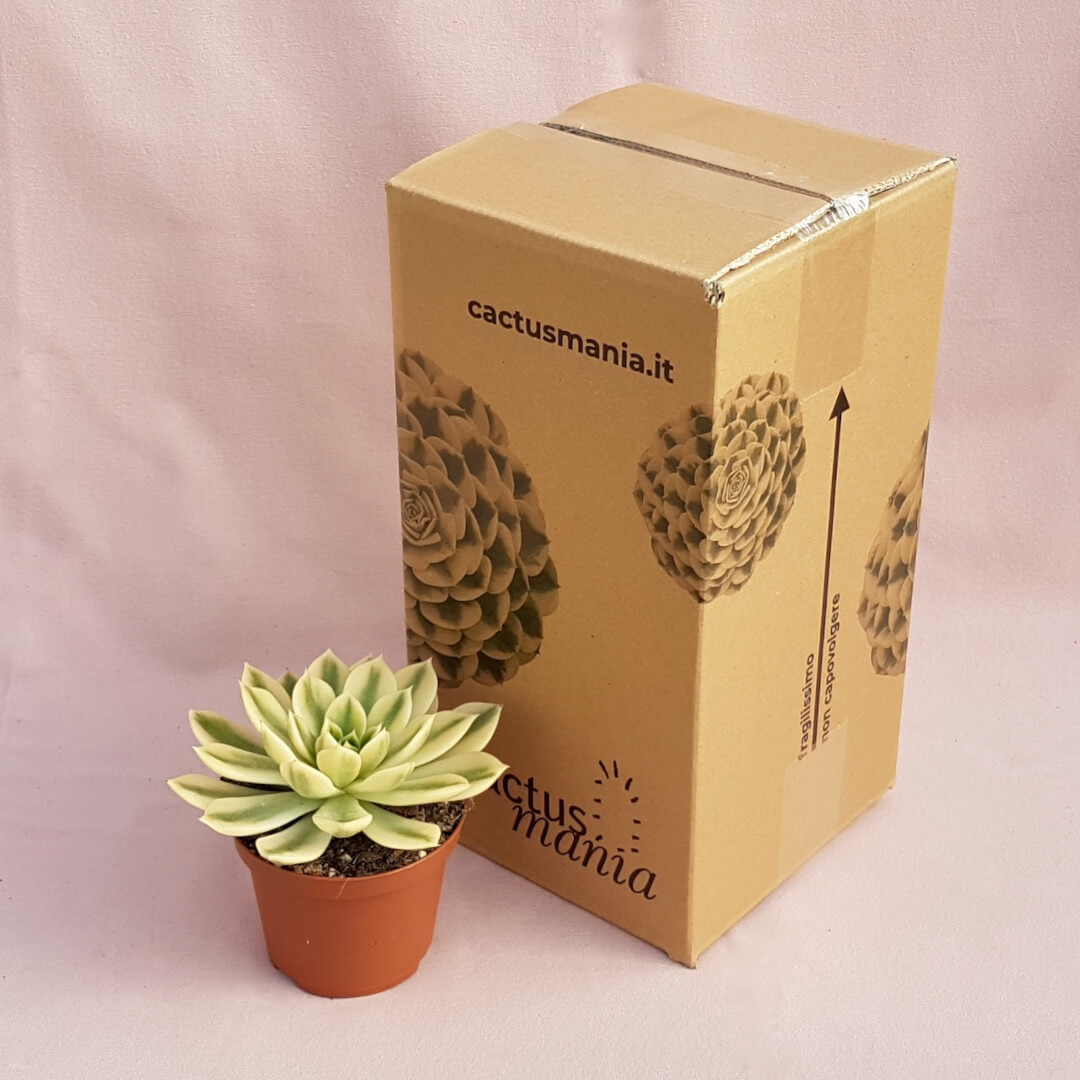 Appartenente alla famiglia delle Crassulaceae, questa pianta di Echeveria agavoides ‘Mira’ variegata viene fornita in vaso Ø 10.5 con etichetta recante il nome botanico.