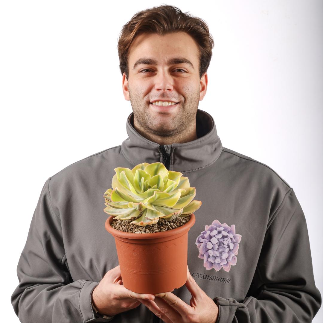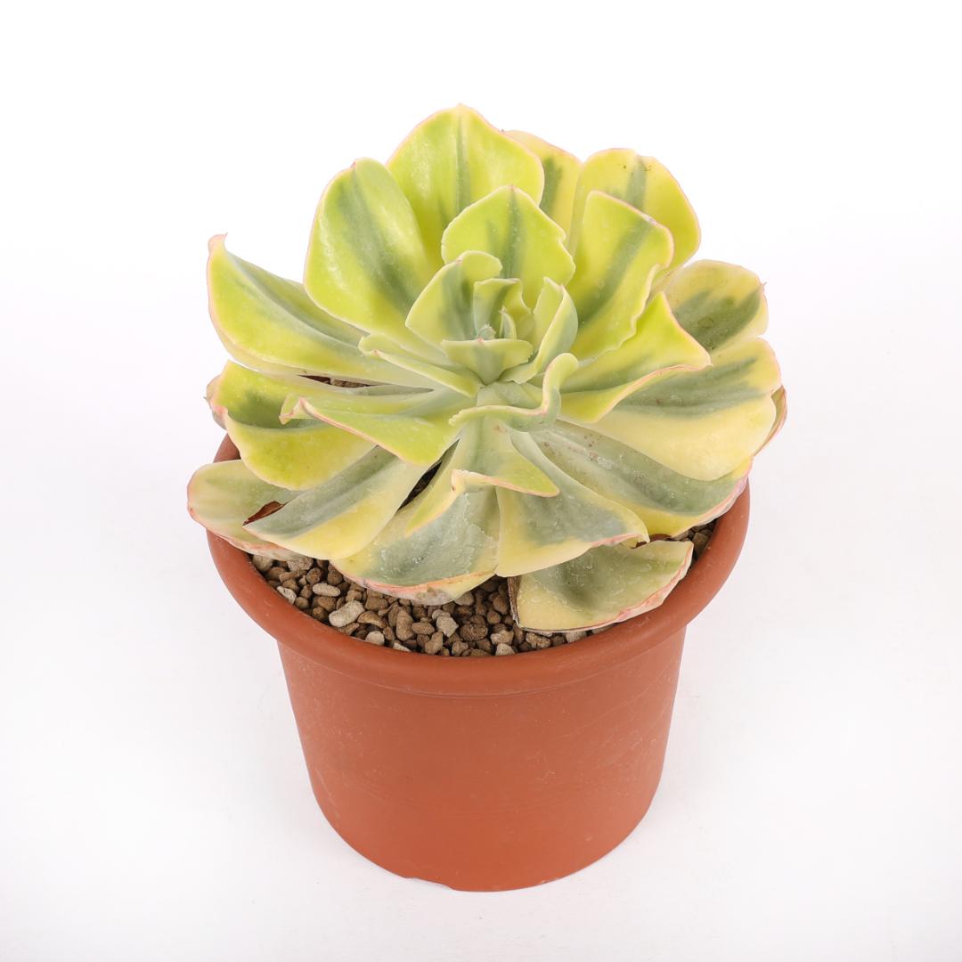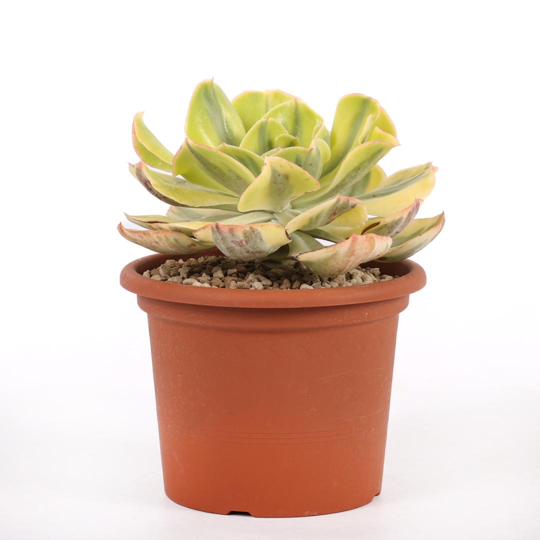 Echeveria ‘Blue Waves’ variegata, rosetta dai toni blu-verde sfumata dai bordi ondulati color crema dal quale viene ripreso il nome (waves). Perfetta per amanti di succulente rare ed esclusive. Richiede poche cure, ama la luce e teme i ristagni d’acqua.