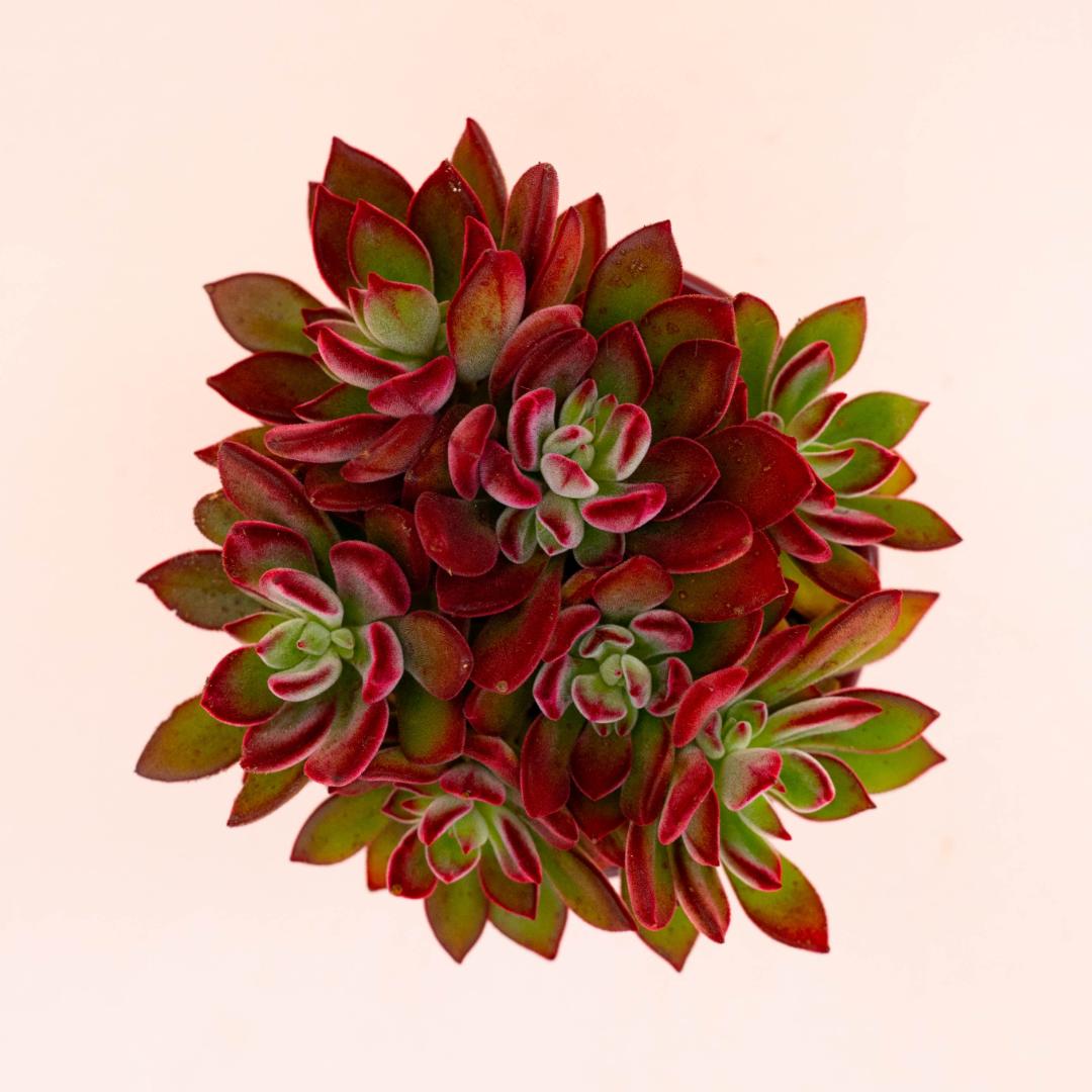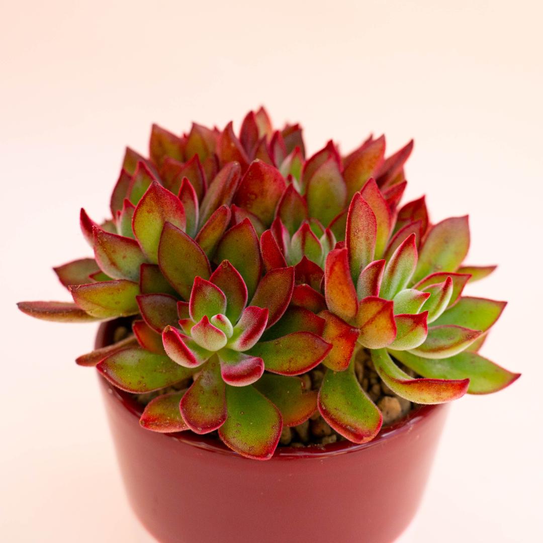 Echeveria Devotion ha foglie verdi bordate di rosso bordeaux se lasciate al sole, le foglie sono morbide e vellutate e non puoi stancarti di toccarle. All’aperto, sia in estate che in inverno, è sempre colorata e attira l’attenzione grazie al suo colore intenso. Devotion non fiorisce o lo fa raramente, anche questo è un punto importante perché la pianta rimane sempre composta e ordinata.