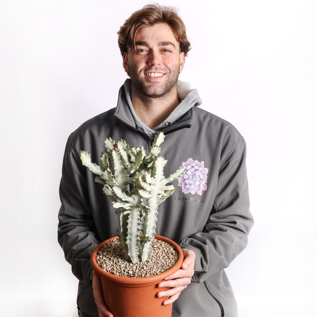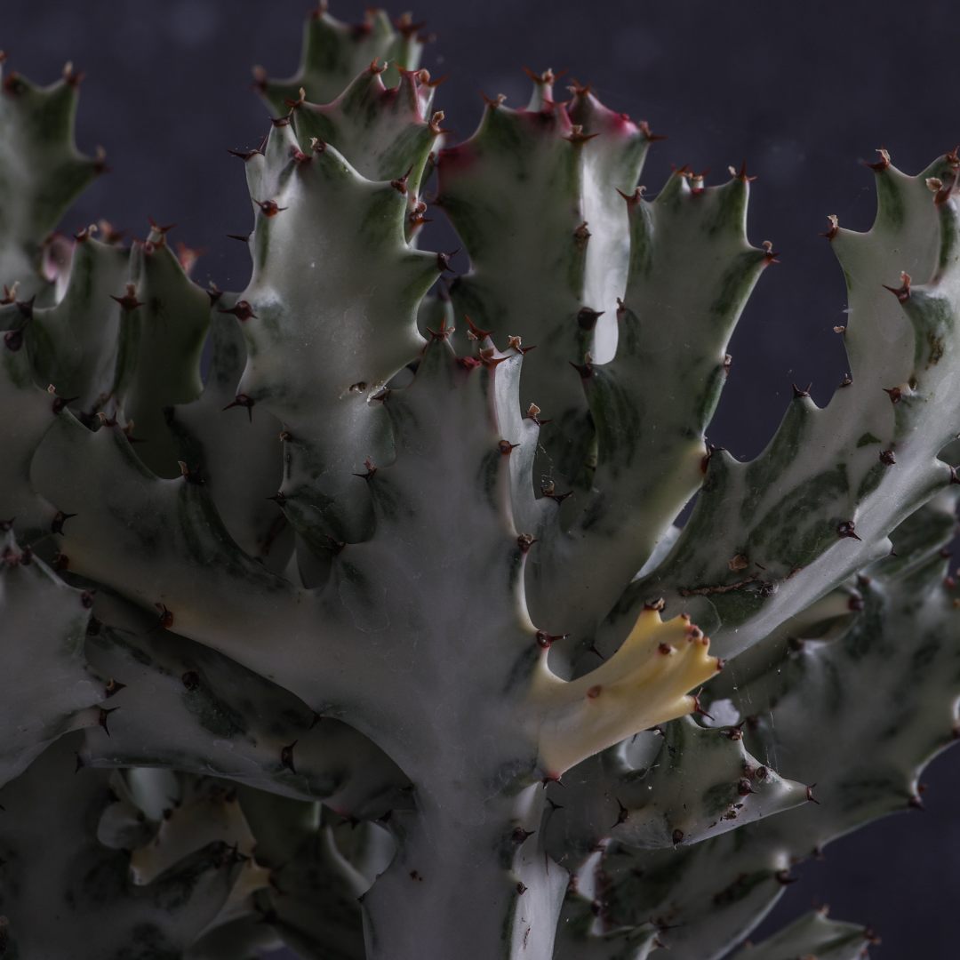 Euphorbia lactea white ghost, nota per il suo aspetto spettrale e la quasi totale assenza di clorofilla, che la rende una pianta a crescita lenta e molto apprezzata. Richiede poche cure, ama la luce e teme i ristagni d’acqua. Perfetta per i collezionisti di rarità e di stranezze.