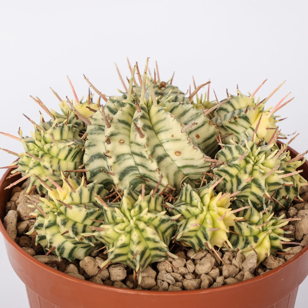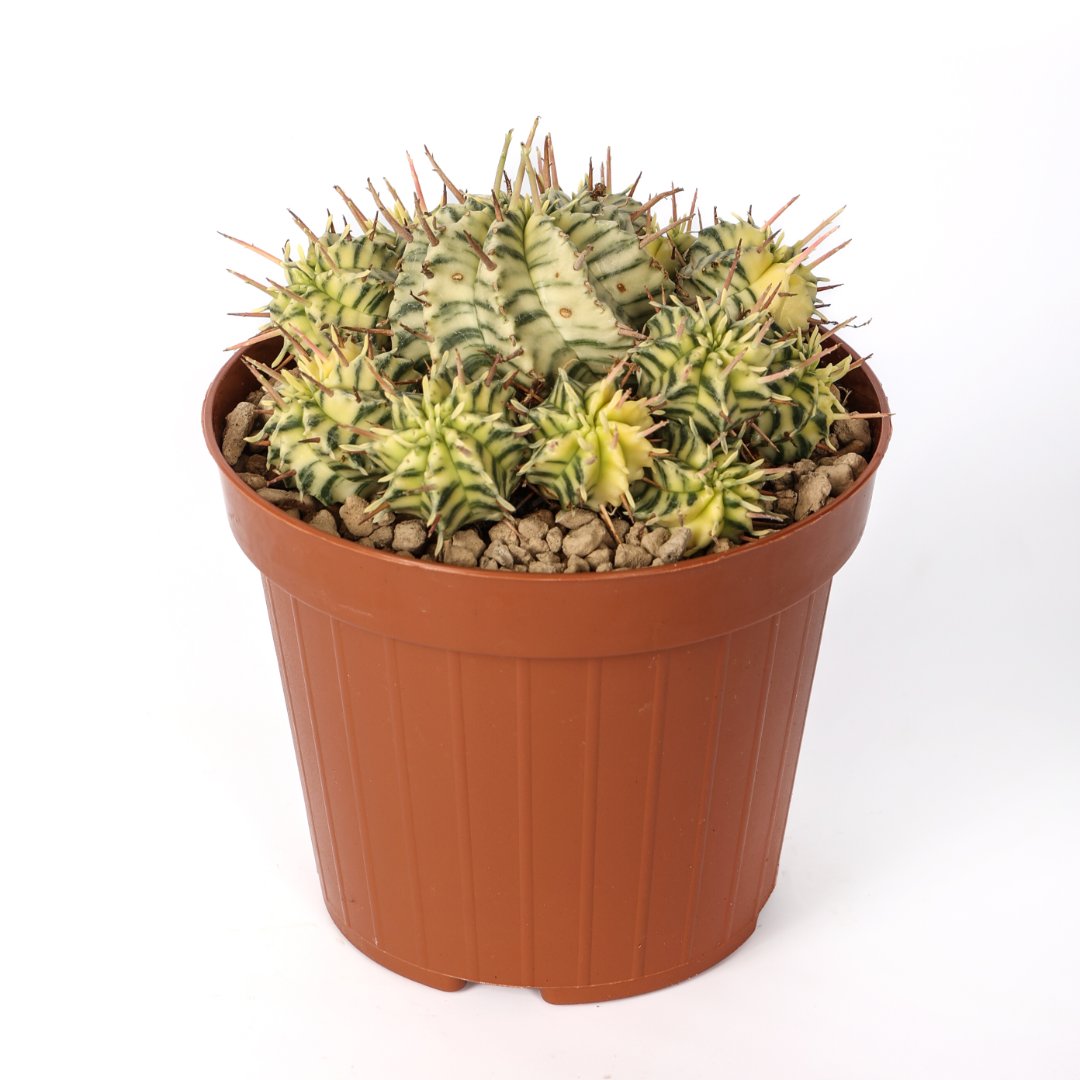 Euphorbia meloformis variegata, succulenta ornamentale. Variegature crema e costolature ben marcate. Richiede poche cure, ama la luce e teme i ristagni d’acqua. Perfetta per gli amanti di Euphorbia e di grasse.