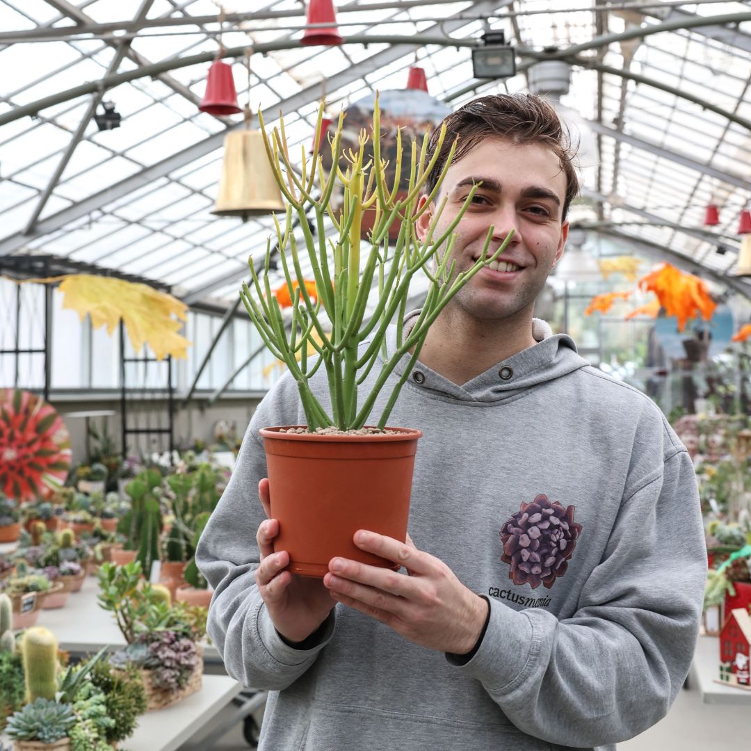 Appartenente alla famiglia delle Euphorbiaceae, questa pianta di Euphorbia tirucalli ‘Sticks of Fire’ è fornita in un vaso Ø 17 cm con un’etichetta che ne riporta il nome botanico.