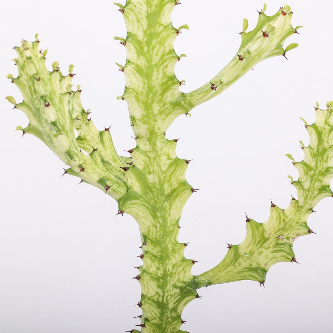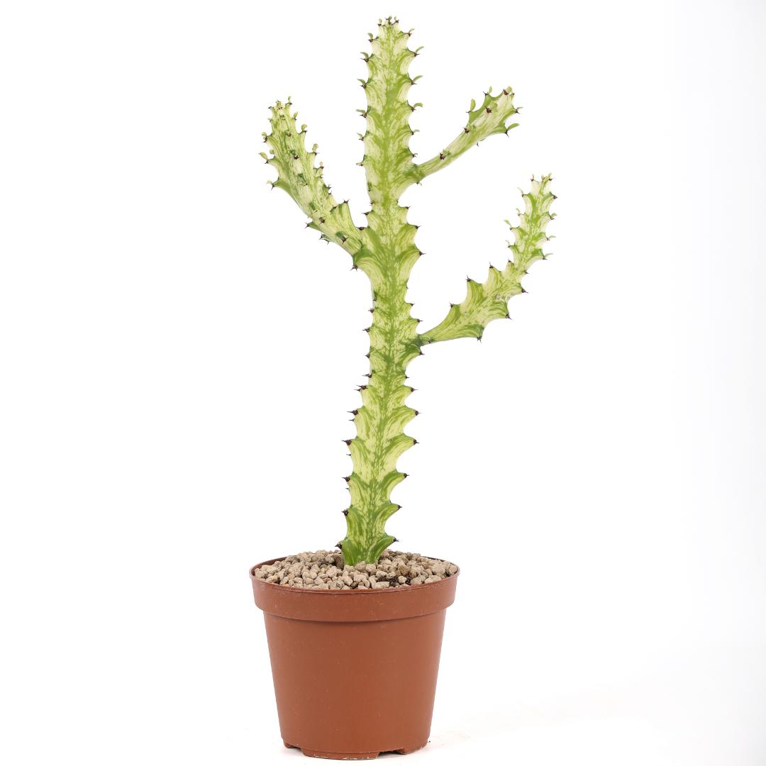 Euphorbia trigona ‘Mint cream’, forma rara e decorativa della Euphorbia trigona, presenta sfumature artistiche e ornamentali. Richiede poche cure, ama la luce e teme i ristagni d’acqua. Perfetta per i collezionisti di Euphorbia e amanti di piante esotiche.