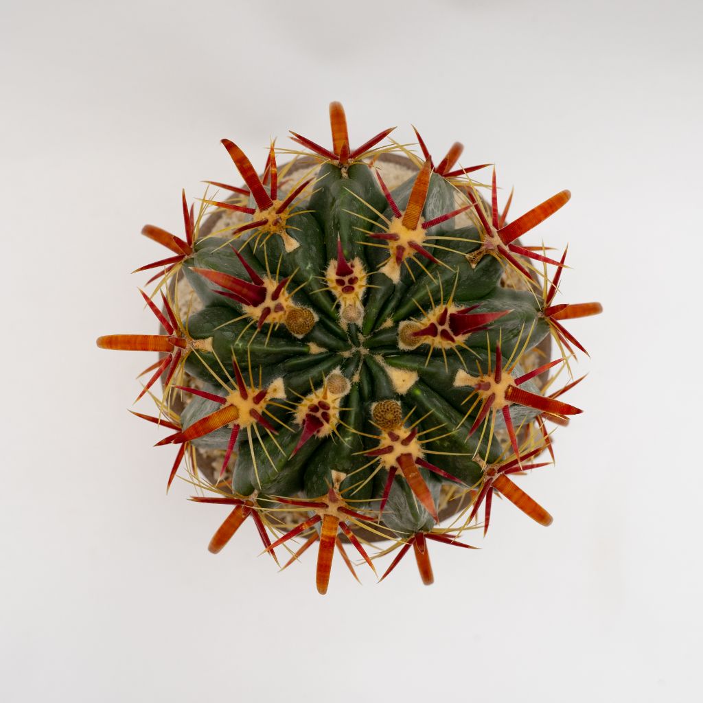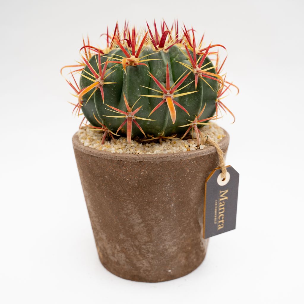 Il Ferocactus latispinus della Linea Manera, appartenente alla famiglia delle Cactaceae, viene fornito nell’elegante vaso in terracotta Choco tondo piccolo Ø 16 cm con etichetta recante il nome botanico.