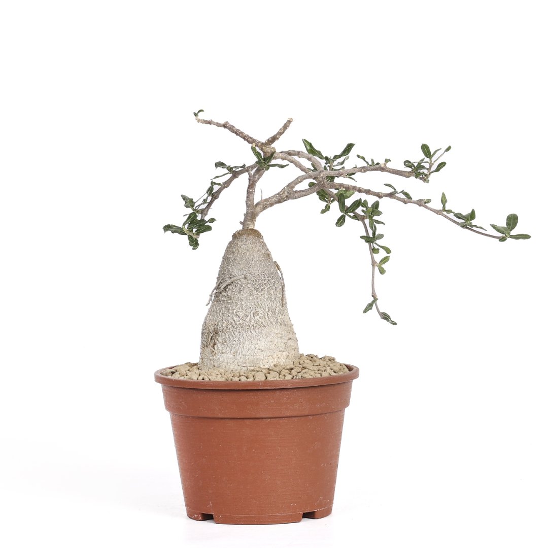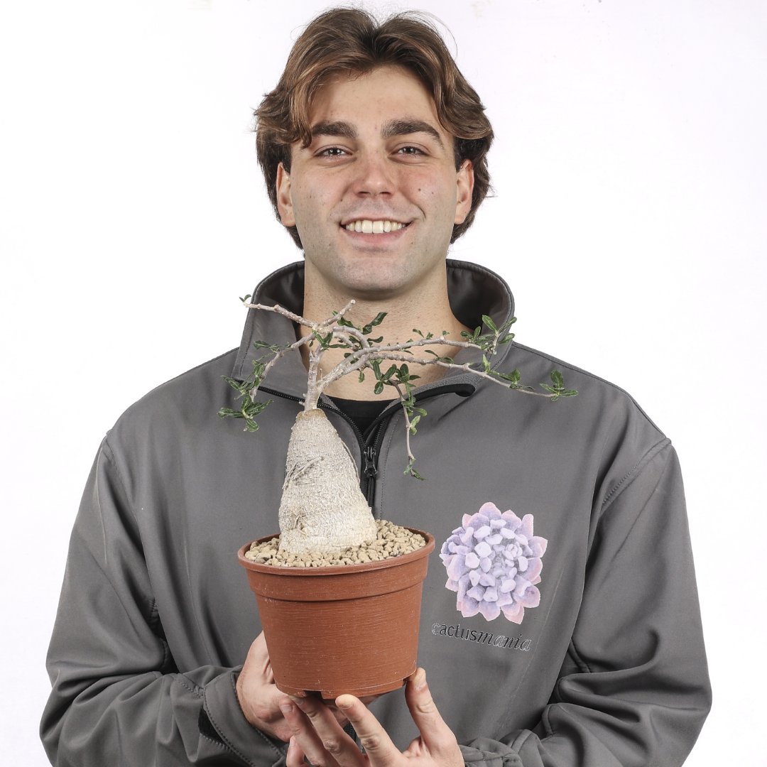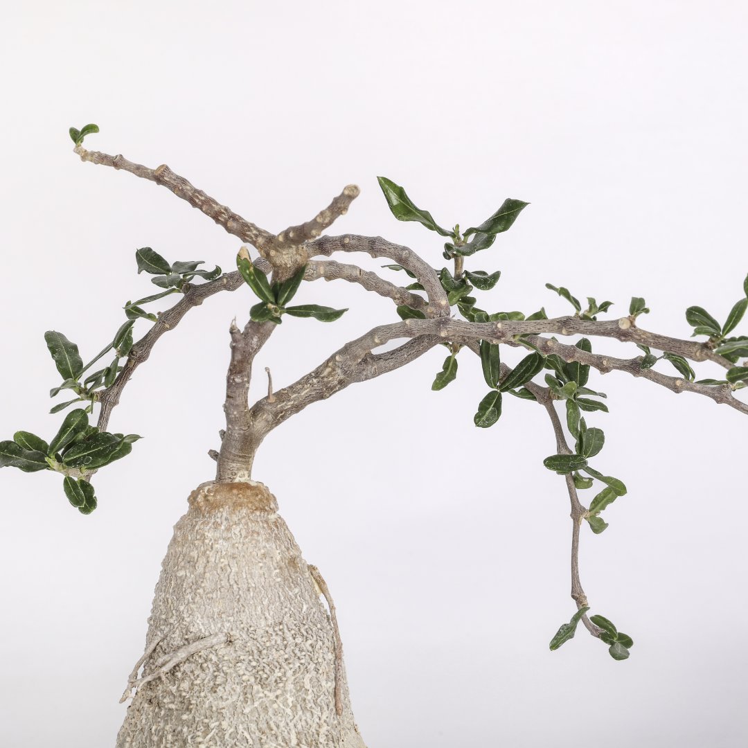 Fockea edulis, pianta succulenta caudiciforme molto apprezzata dai collezionisti per il suo fusto basale ingrossato e scultoreo. Dal caudex si sviluppano rami sottili e rampicanti con foglie verdi, lanceolate e lucide. Richiede poche cure, ama la luce e teme i ristagni d’acqua. Perfetta per i collezionisti di rarità e piante caudiciformi.