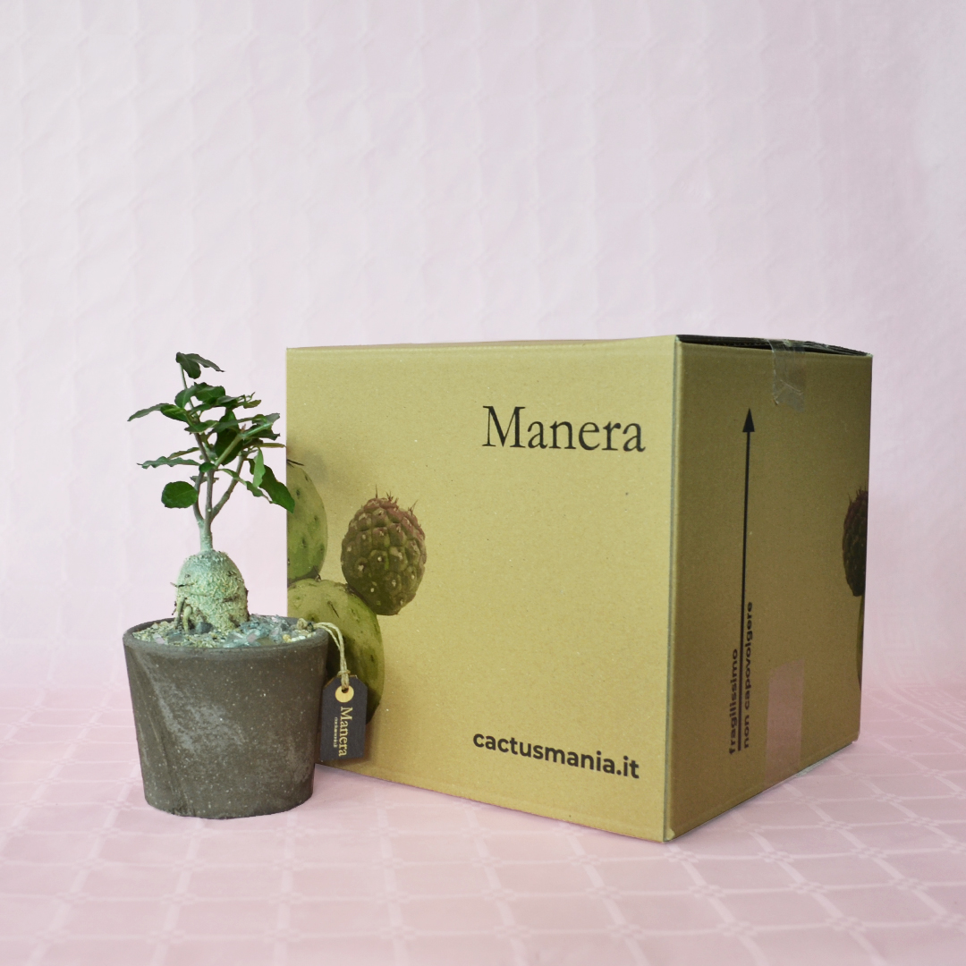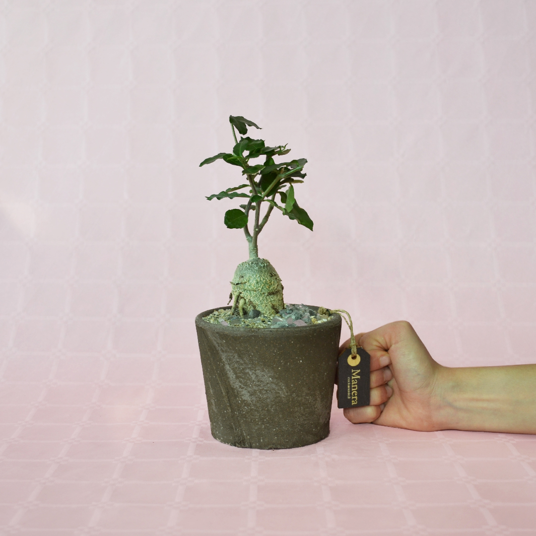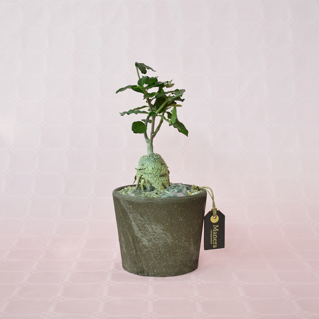 La Fockea edulis della Linea Manera, appartenente alla famiglia delle Apocynaceae, viene fornita nell’elegante vaso in terracotta Choco small Ø 12 con etichetta recante il nome botanico.