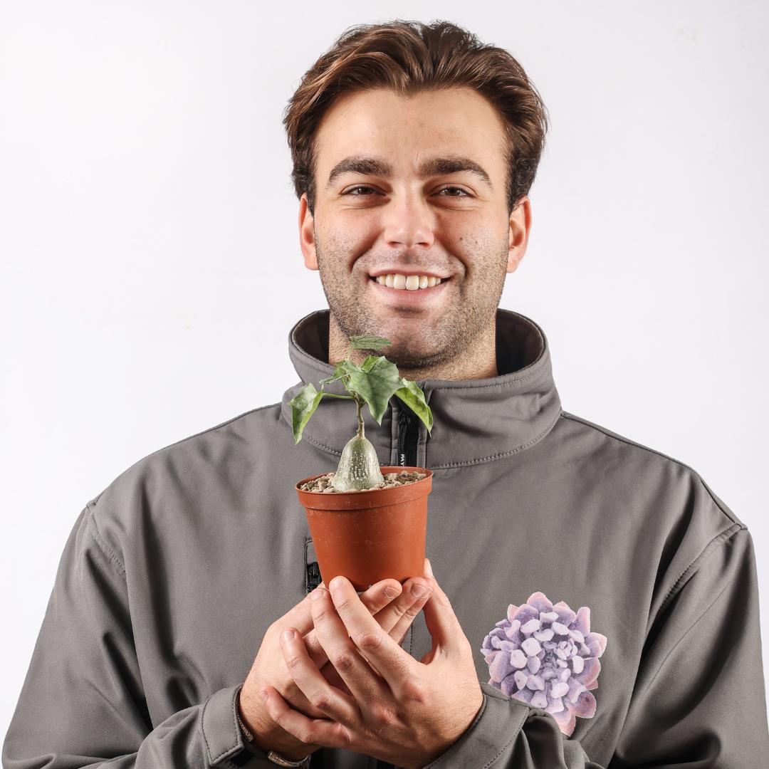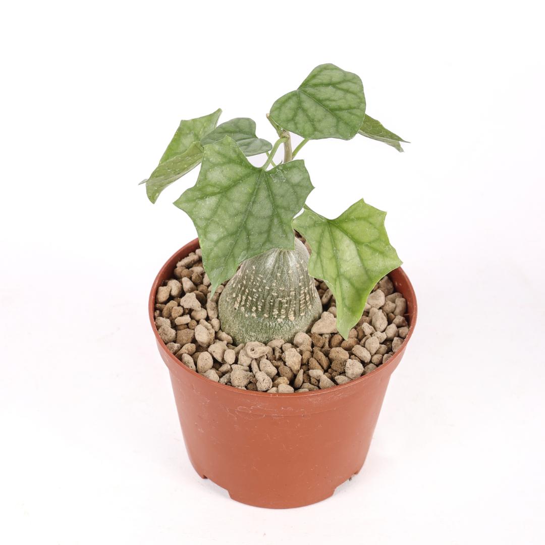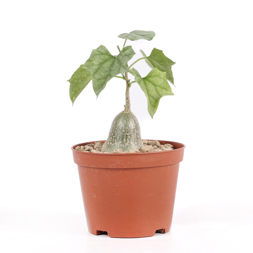 Gerrardanthus macrorhizus, nota per il suo caudice a forma di bottiglia e per le foglie sottili e di un verde acceso. Perfetta per gli amanti di piante insolite, rare e curiose. Ama la luce e le annaffiature moderate, specialmente durante la stagione vegetativa. Non vuole acqua d’inverno, durante il suo riposo vegetativo nel quale perderà le foglie.