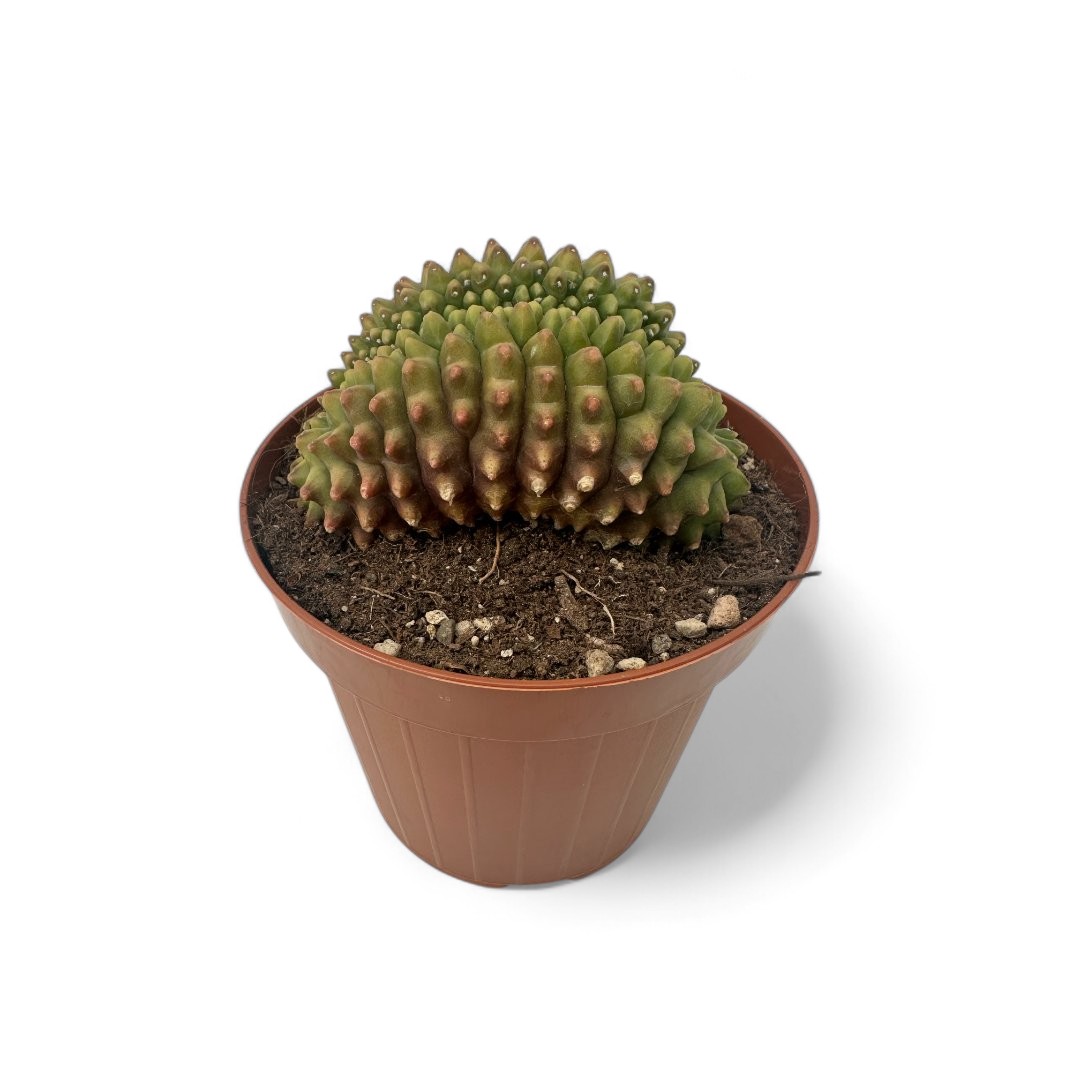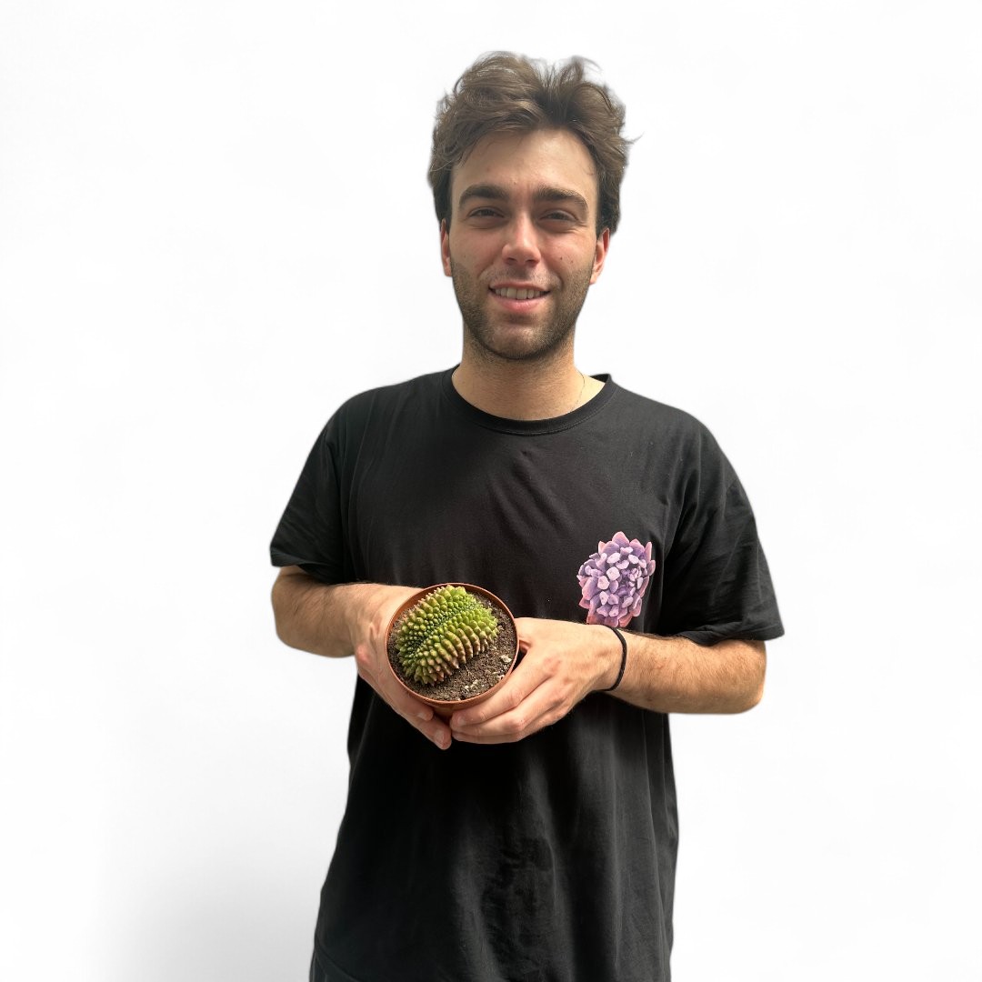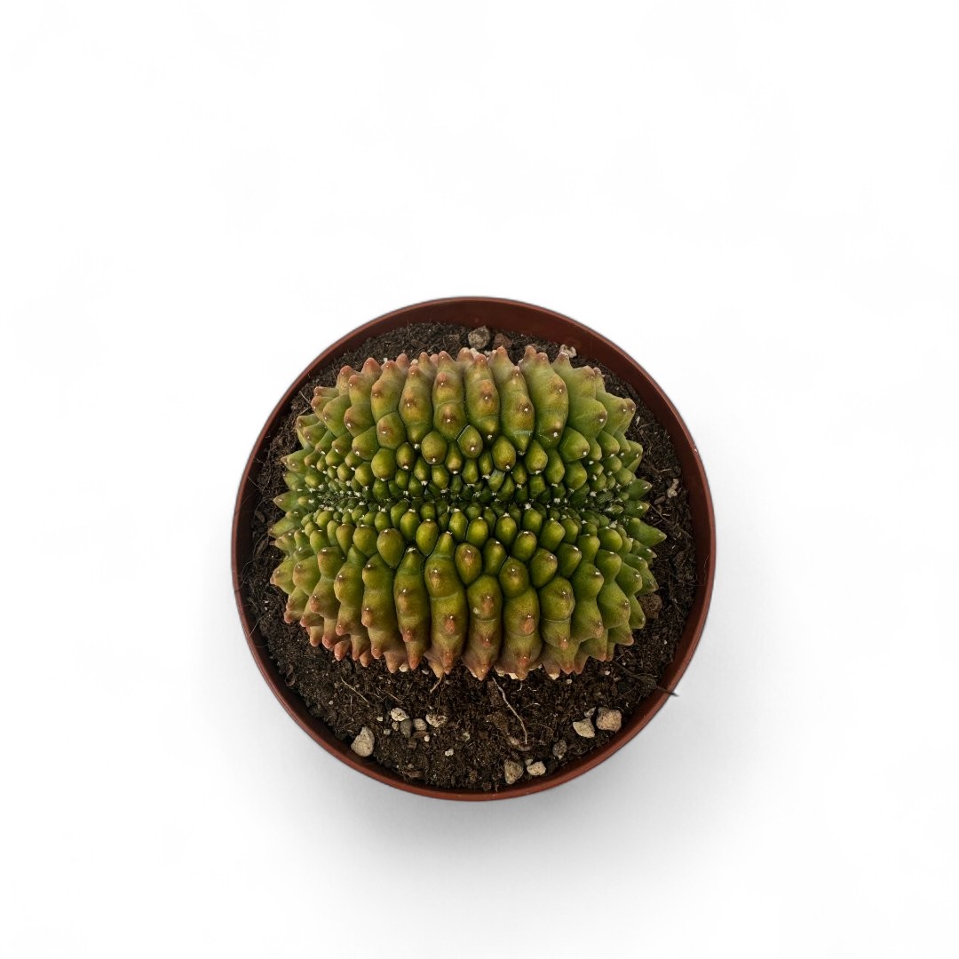 Appartenente alla famiglia delle Cactaceae, questa pianta rara di Gymnocalycium mihanovichii inermis crestato è fornita in un vaso Ø 12 cm con un’etichetta che ne riporta il nome botanico.
