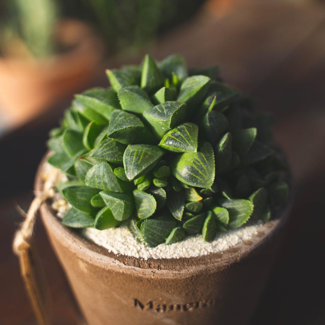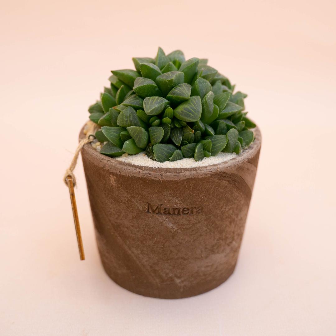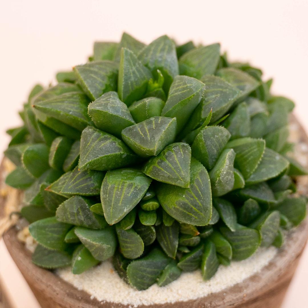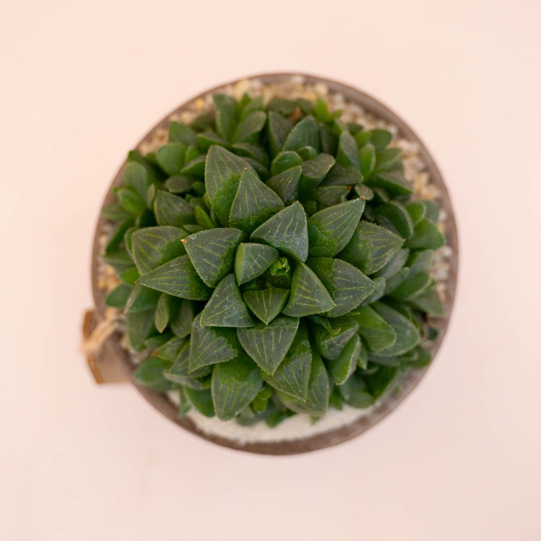 L’Haworthia retusa viene fornita nell’elegante vaso in terracotta Choco small Ø 12 cm con etichetta recante il nome botanico.