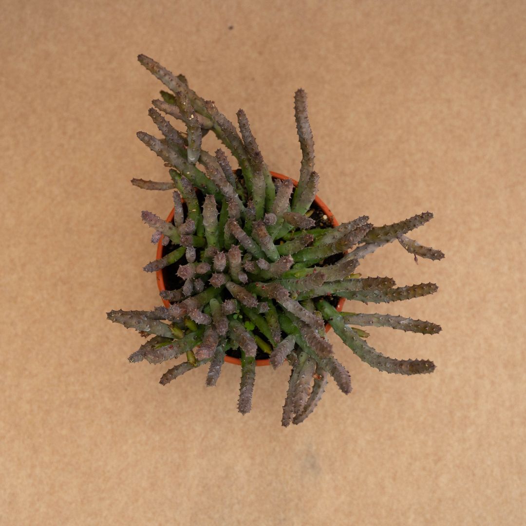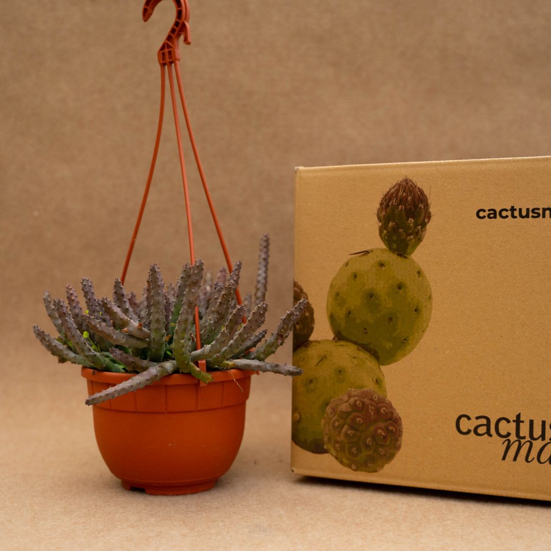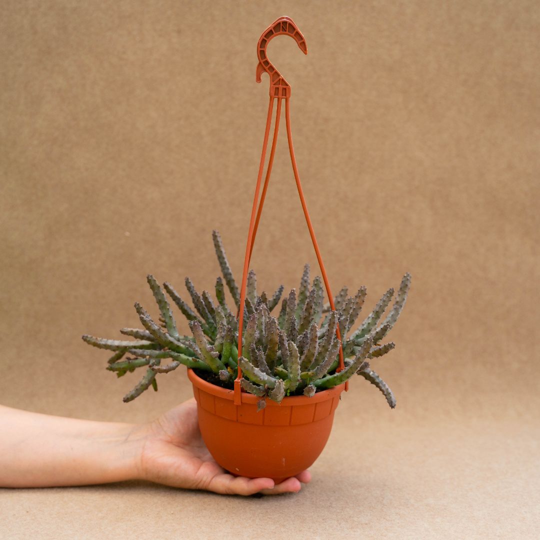 Appartenente alla famiglia delle Asclepiadaceae, questa pianta di Huernia pendula viene fornita in vaso basket da appendere Ø 14 con etichetta recante il nome botanico.