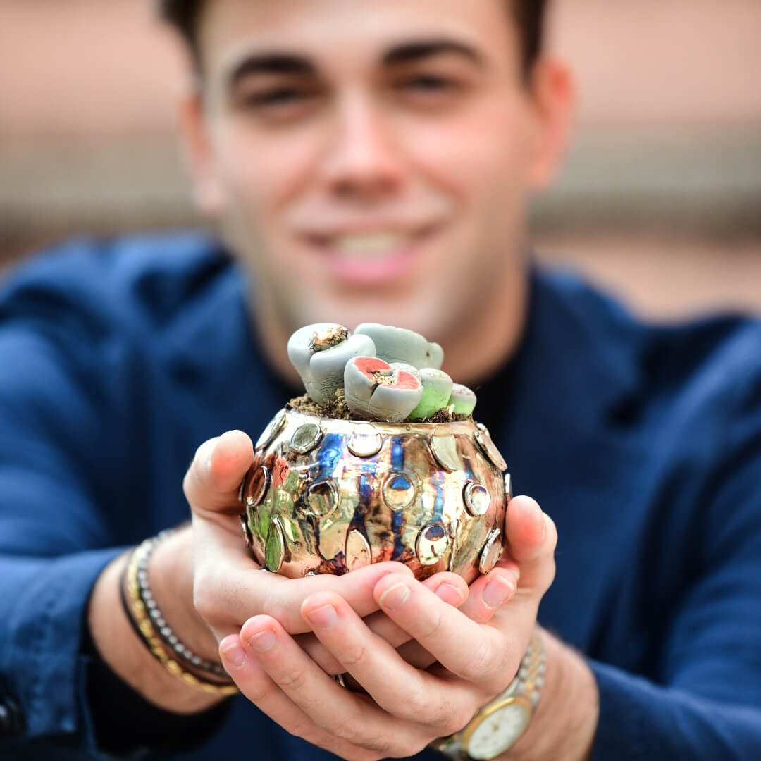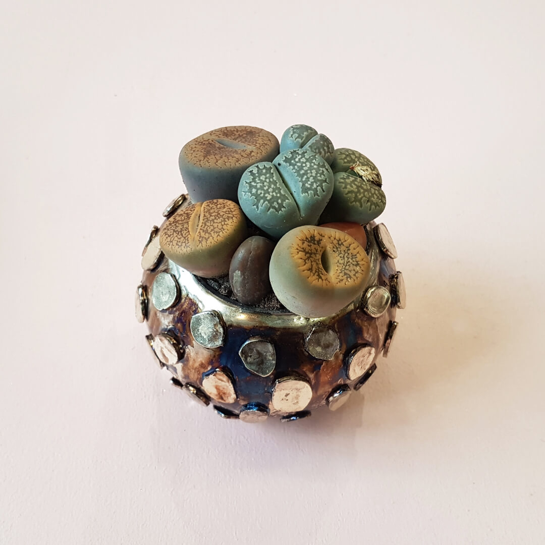 Composizione di Lithops adulti scelti in diverse varietà contenuti in un vaso di vetro decorato con medaglie brillanti. Il vaso è alto 10 cm e ha un diametro di 11 cm.