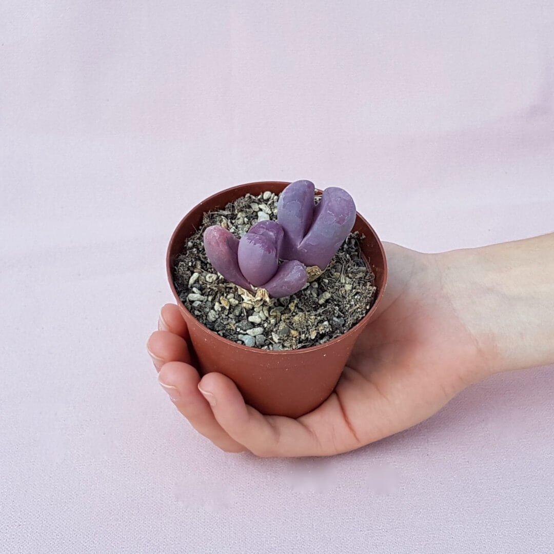 Appartenente alla famiglia delle Aizoaceae, questa pianta di Lithops optica ‘Rubra’ viene fornita in vaso Ø 7,5 con etichetta recante il nome botanico.