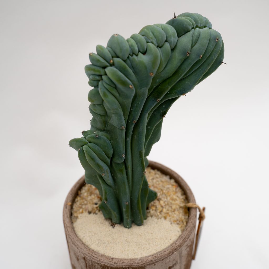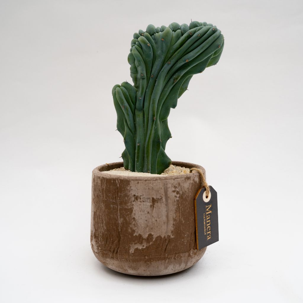 Il Myrtillocactus geometrizans forma cristata della Linea Manera, appartenente alla famiglia delle Cactaceae, viene fornita nell’elegante vaso in terracotta Choco Ø 14 cm, con etichetta recante il nome botanico.
