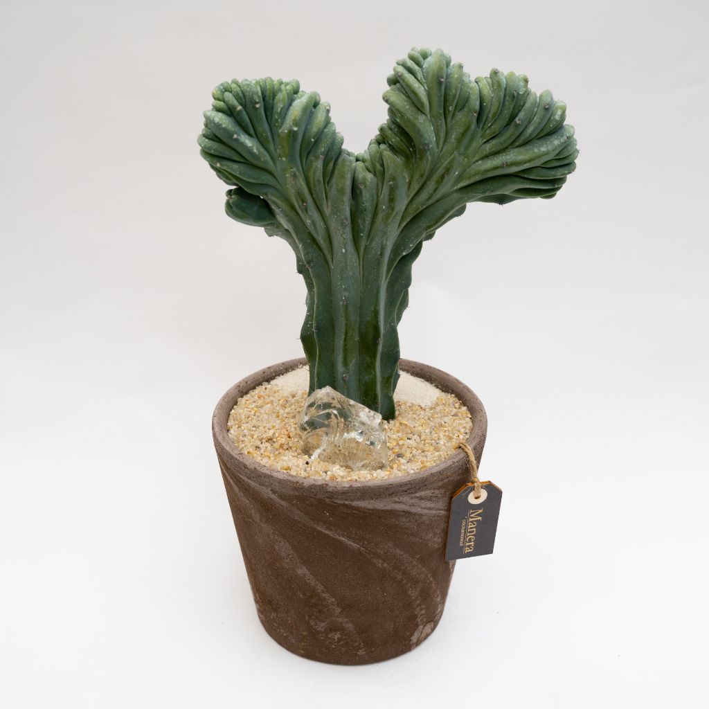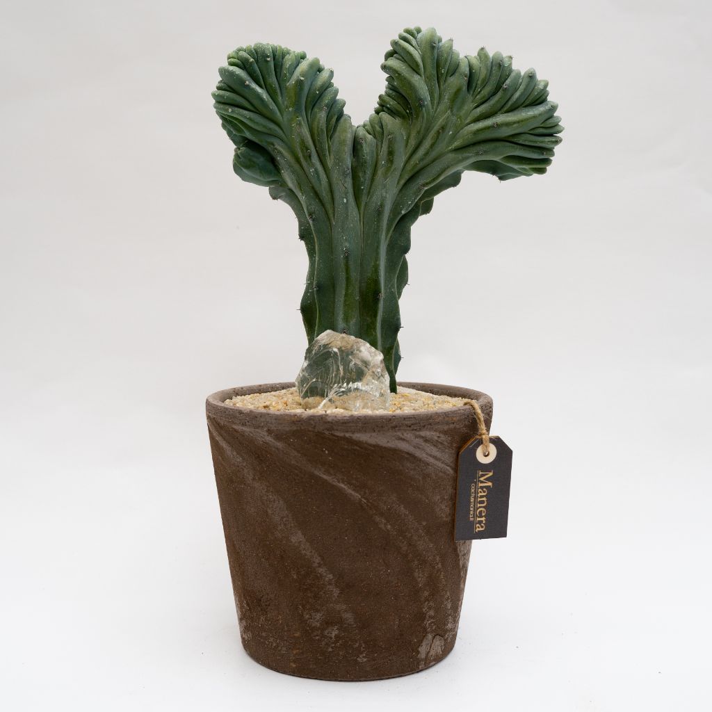Il Myrtillocactus geometrizans forma cristata della Linea Manera, appartenente alla famiglia delle Cactaceae, viene fornita nell’elegante vaso in terracotta Choco Ø 20 cm, con etichetta recante il nome botanico.